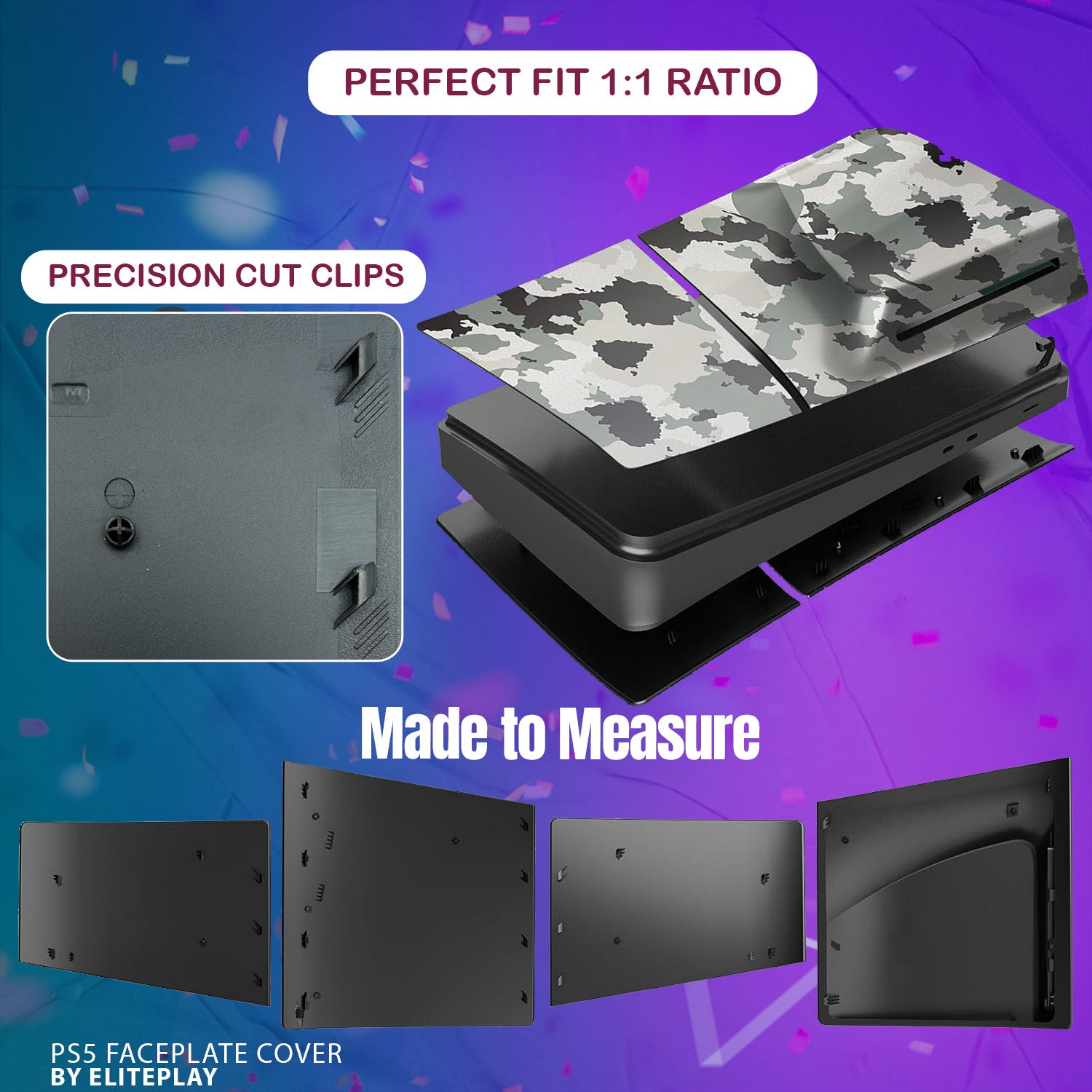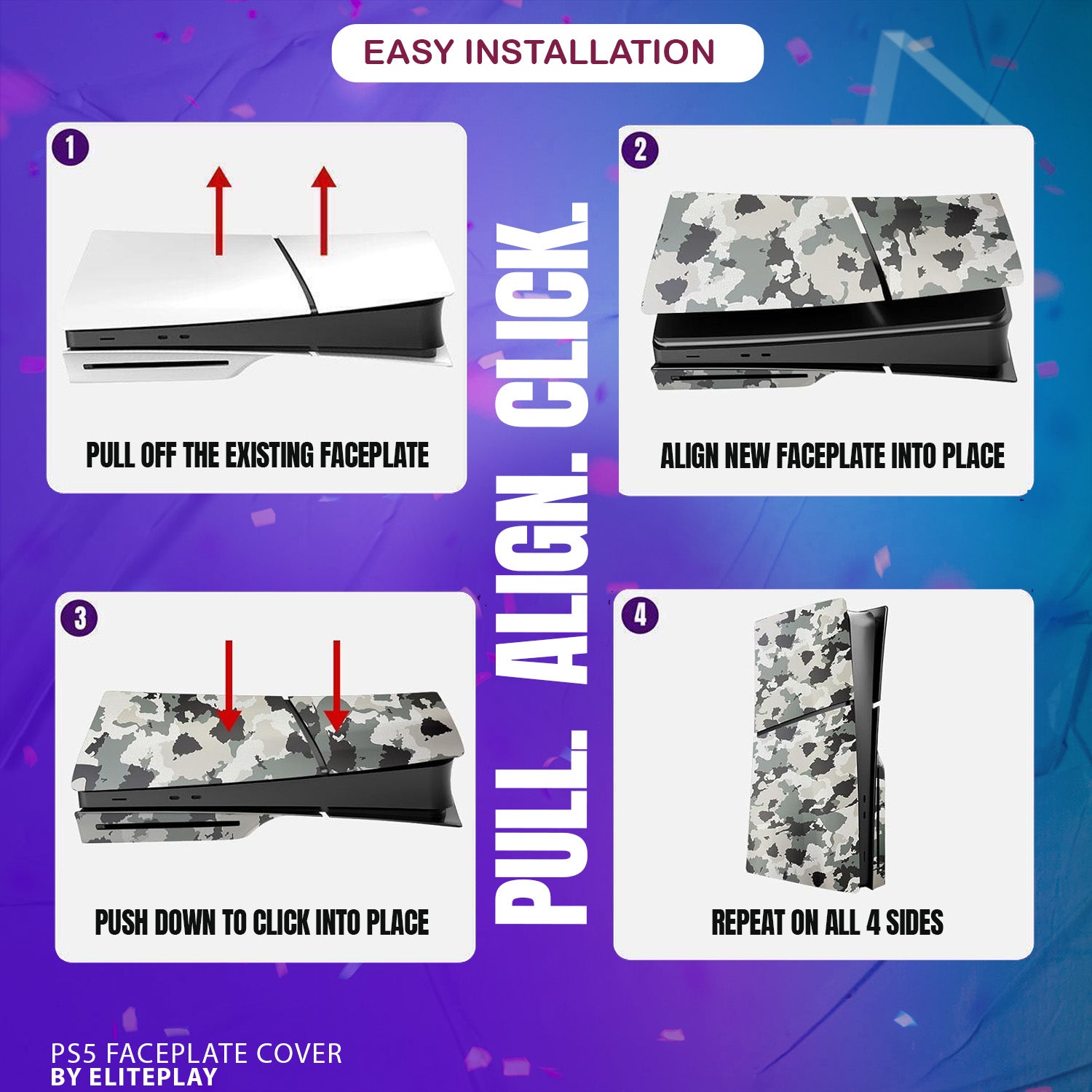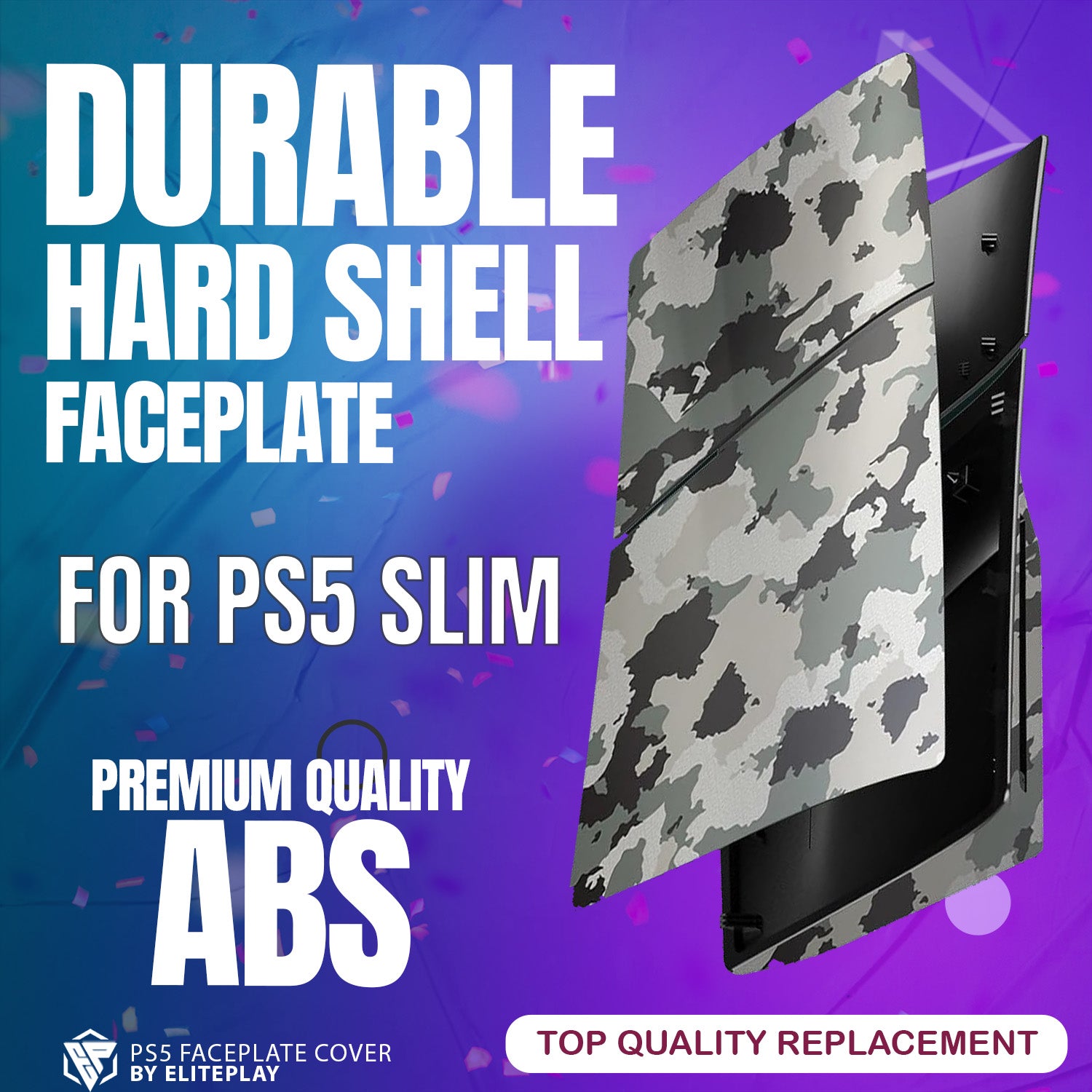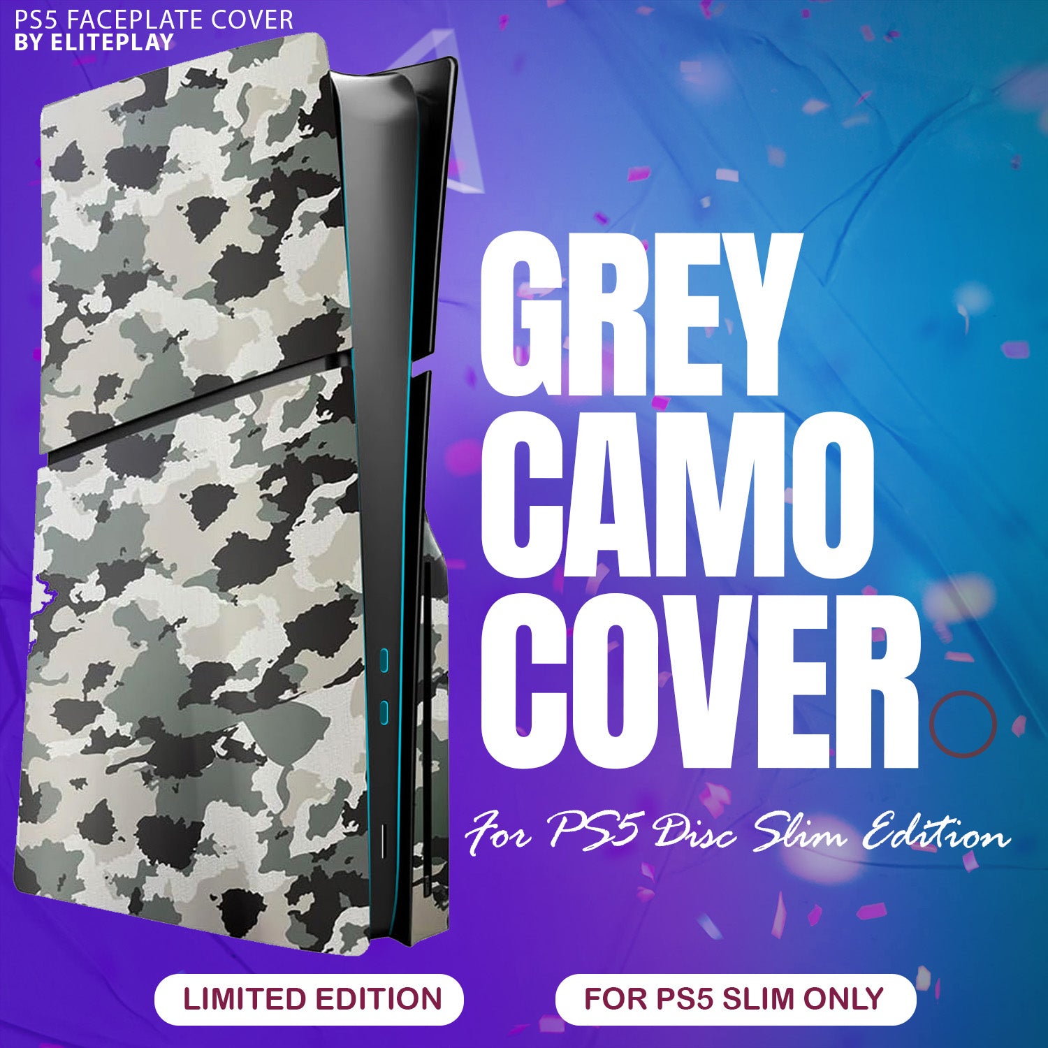Give your PlayStation 5 Slim a tactical upgrade with the ElitePlay Grey Camo Faceplate. This uniquely designed faceplate for the PS5 Slim Model Disc Edition not only provides a distinctive grey camouflage pattern but also incorporates enhanced cooling to keep your console performing at its peak. The durable material and precise fit offer comprehensive protection and a striking appearance that stands out from the crowd. With easy installation, this faceplate is ideal for gamers who want to combine functionality with an aggressive aesthetic edge.