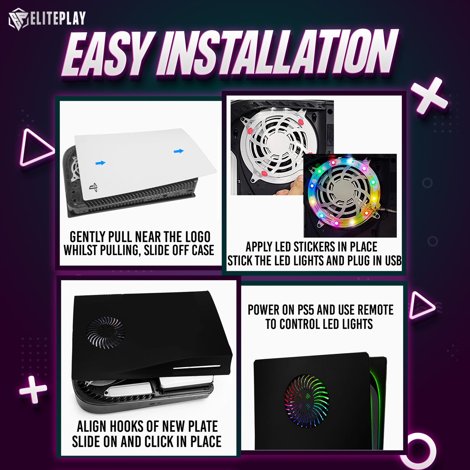 - 【EASY INSTALLATION AND REMOVAL 】- Precision cut clips that match your current PS5 faceplate allowing for easy removal and installation of the new black faceplate for your Disc Edition PS5. LED lights easily installed with stickers included so there is hassle free installation directly onto the fan plate.