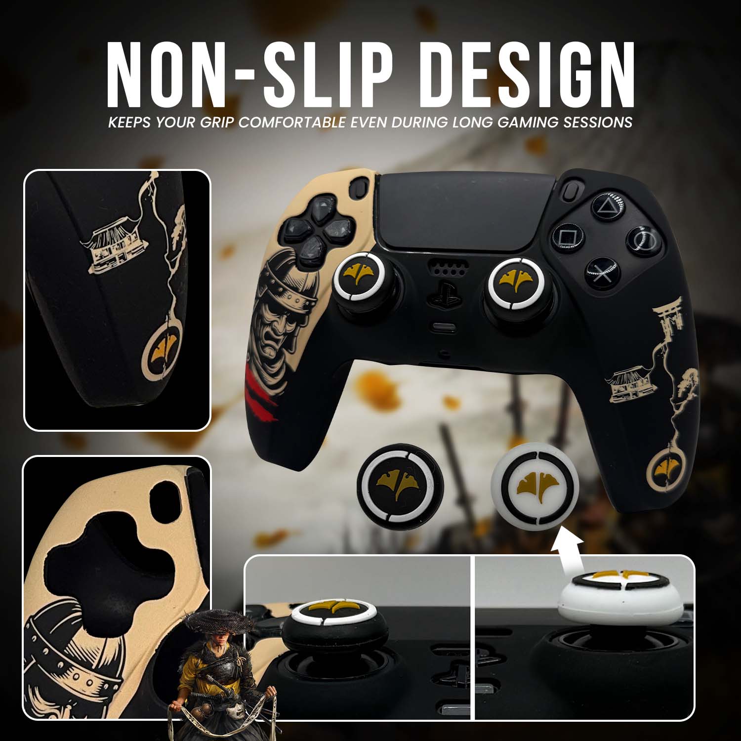 • Complete Grip Kit Included – Comes with 4 matching thumb grips (2 black, 2 white) featuring Ghost Yotei style logo designs for enhanced control and style.